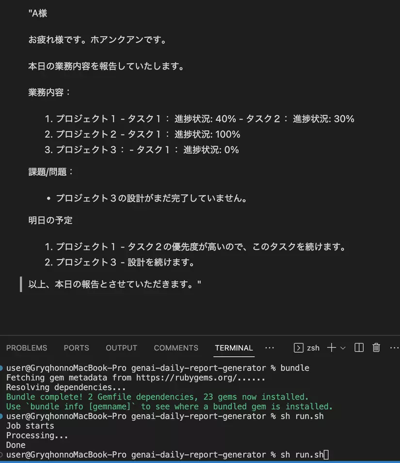 ですから、日報を書く作業をより簡単にするために、プロジェクトのタスク、進捗状況、明日の予定作業などを取得するだけで、自動的に日報を生成できるようにしたいと考えています。私は Ruby が大好きで、最新の生成AI技術を適用したいと思い、新しいプロジェクトを始めました。